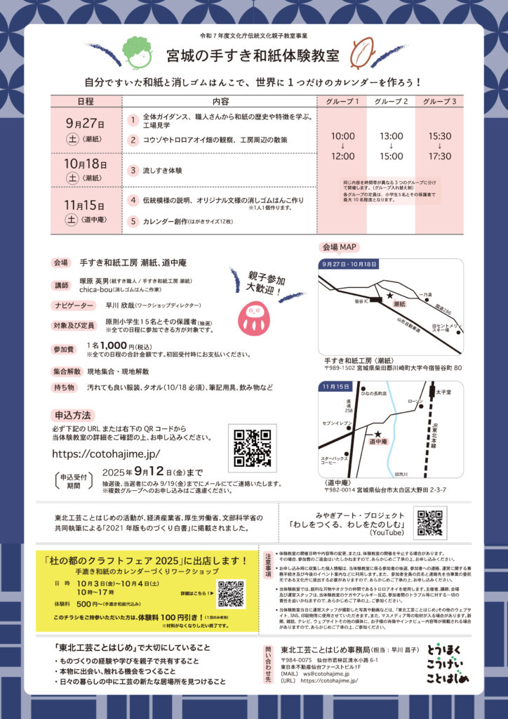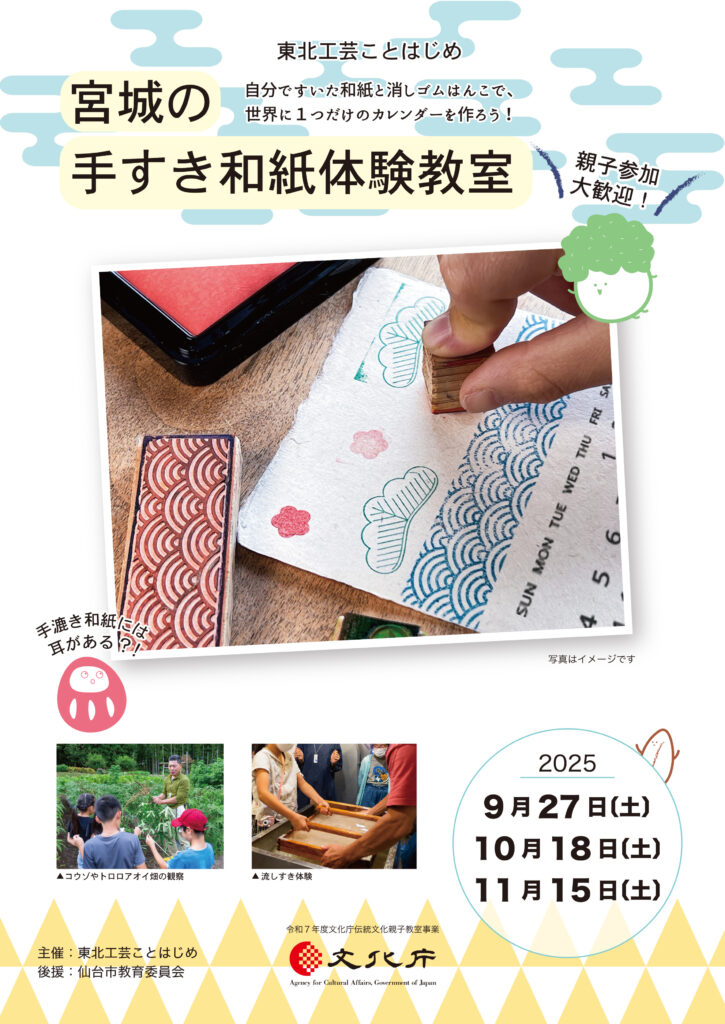 2025年9月27日(土)、10月18日(土)、11月15日(土)に、「宮城の手すき和紙体験教室」(令和7年度文化庁伝統文化親子教室事業、主催:東北工芸ことはじめ、後援:仙台市教育委員会)を開催します。